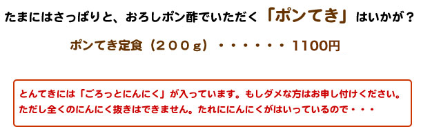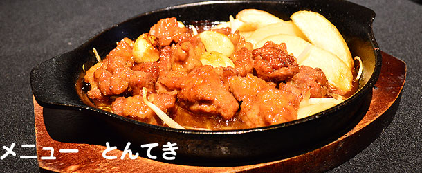 クルーの人気メニューとんてきは豚肉とにんにくと醤油だれを鉄板で焼き上げるボリューム満点な一品です。豚肉のうまみ、タレのコクが合わさった絶妙の一品です。あとのせキャベツとの相性も絶品です。